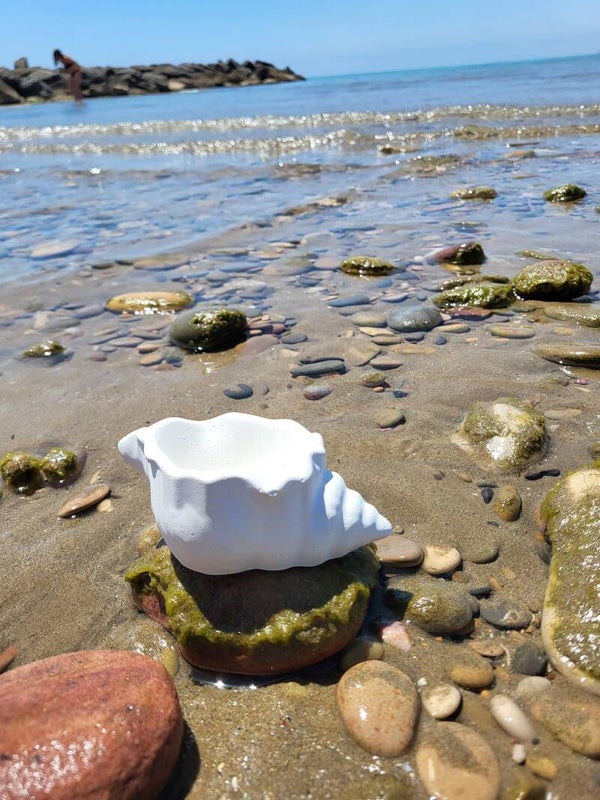Esta pieza en forma de caracola está hecha a mano con resina ecológica, que la hace ligera, resistente y respetuosa con el medio ambiente.