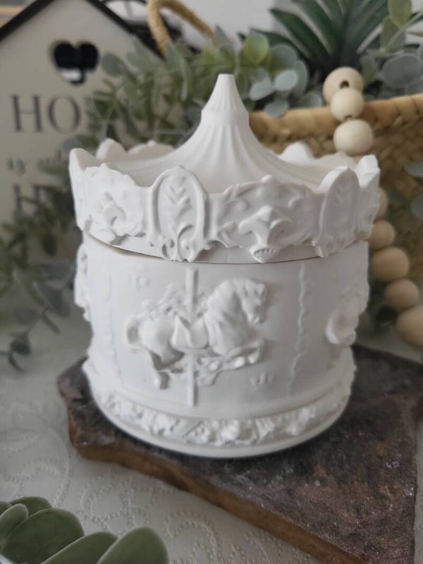 Viene en un delicado recipiente de resina ecológica, con diseño de carrusel en relieve, ideal para reutilizar como joyero o decoración o para volver a rellenar con nuestros recambios de cera. Una pieza única que combina sostenibilidad, aroma y estilo.